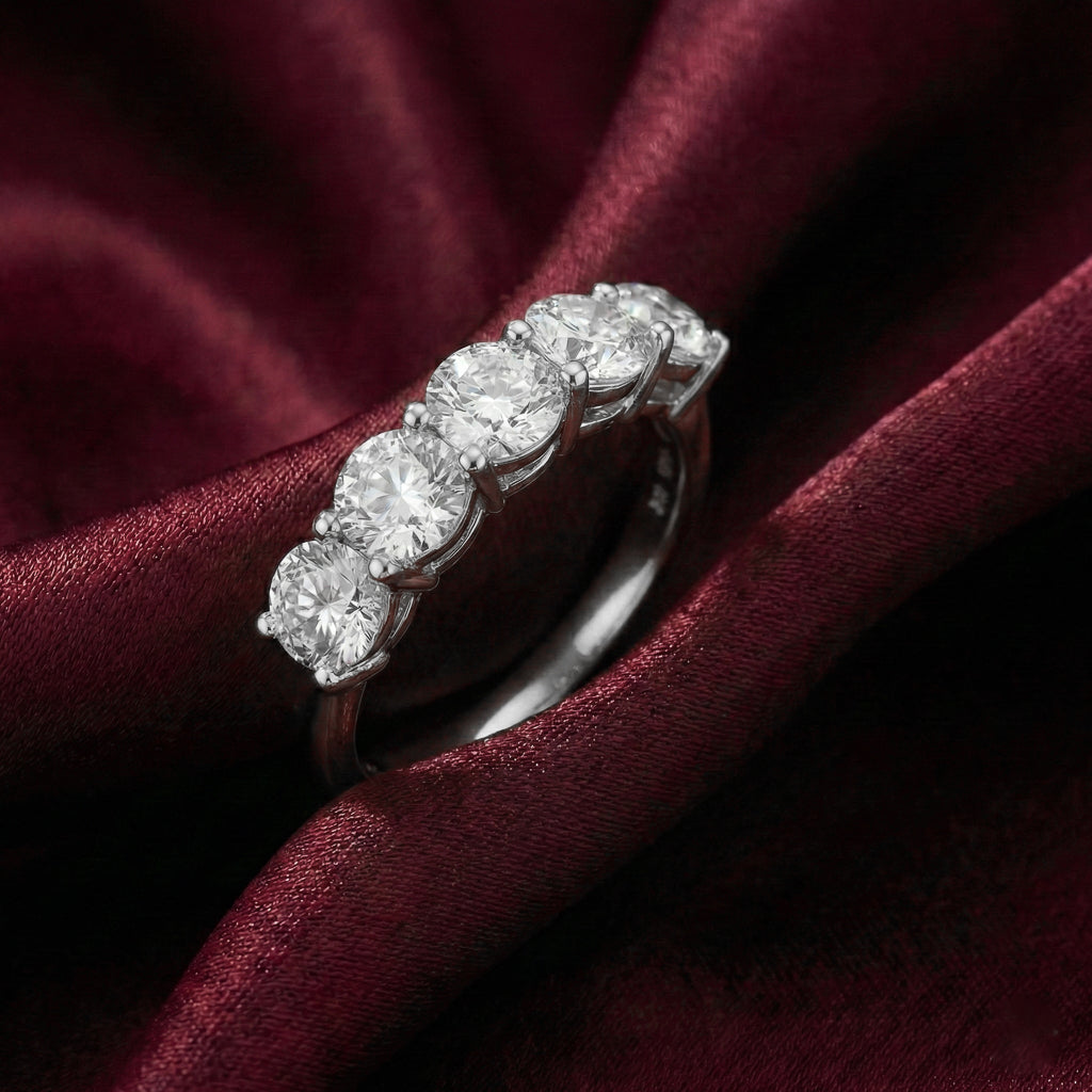 הטבעת בעובי 4.25 מ״מ, עשויה כסף 925 ומשובצת אבני מואסנייט במשקל כולל של 1.75 קראט.