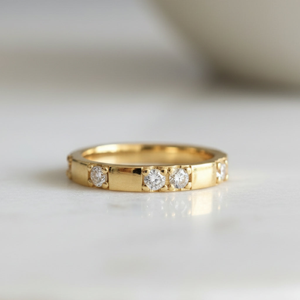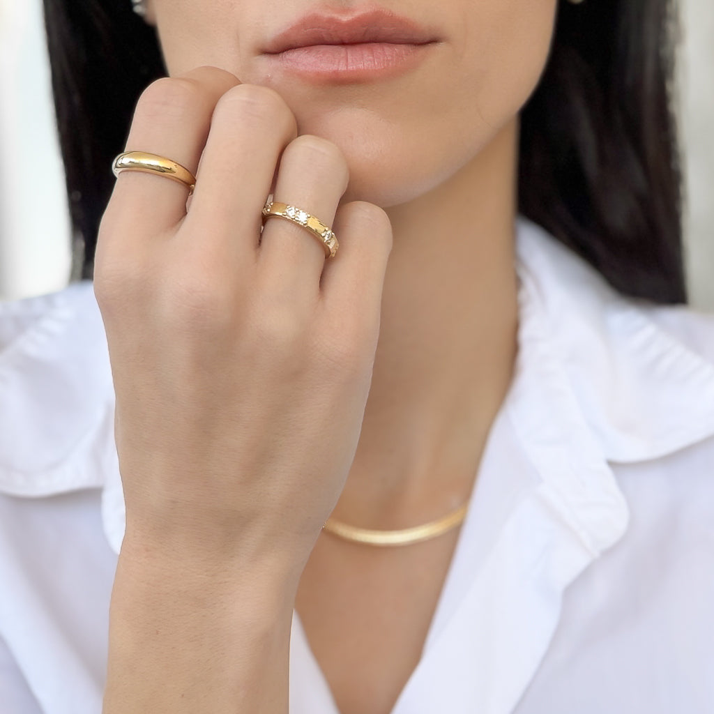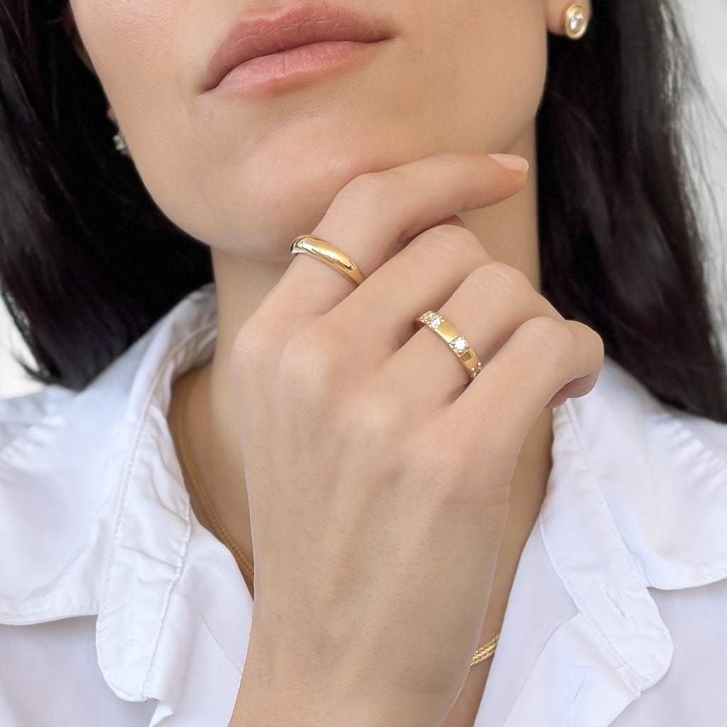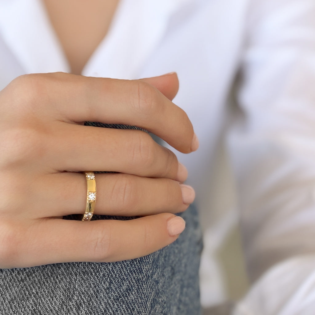 הטבעת בעובי 4 מ״מ, עשויה כסף 925 בציפוי זהב איכותי בעובי 2 מיקרון, ומשובצת 5 אבני מואסנייט בעובי 3.5- 4 מ״מ כל אחת.