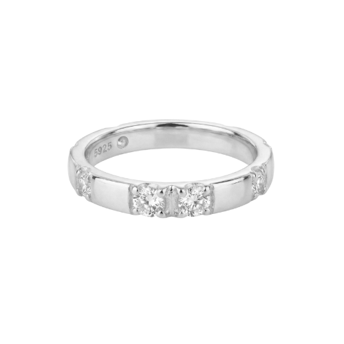 הטבעת בעובי 3.5 מ״מ, עשויה כסף 925 ומשובצת 5 אבני מואסנייט איכותיות בעובי 3 מ״מ כל אחת